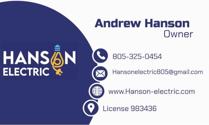 Services: Power up your home or business in in Santa Ynez, CA with the experts at Hanson Electric. Call (805) 325-0454 for professional electrical services that are safe, efficient, and perfectly tailored to your needs. * Electrical Service * Electrical Contractor * Electrical Wiring * Surge Protection * Circuit Breaker Panel Upgrades * Main Panel Upgrades * Ceiling Fan Installation * EV Charging Installation * Generator Repair * Lighting Repair * Generator Installation * Electrical Panel Repair * Doorbell Installation * Doorbell Replacement * Security System Installation * Home Theater Installation * Residential Services * Security System Repair * Circuit Breaker Installation * Circuit Breaker Replacement * Outlets Installation * Switch Relocation
