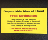 Services: Dependable Man at Hand in Lubbock, TX provides professional tree services. Call 806-543-2202 for a free estimate and compare our prices with other bigger and more expensive businesses in town. * Tree Services * Tree Trimming * Tree Cutting * Tree Removal * Trash Hauling * Fence Installation * Lawn Maintenance * Debris Removal