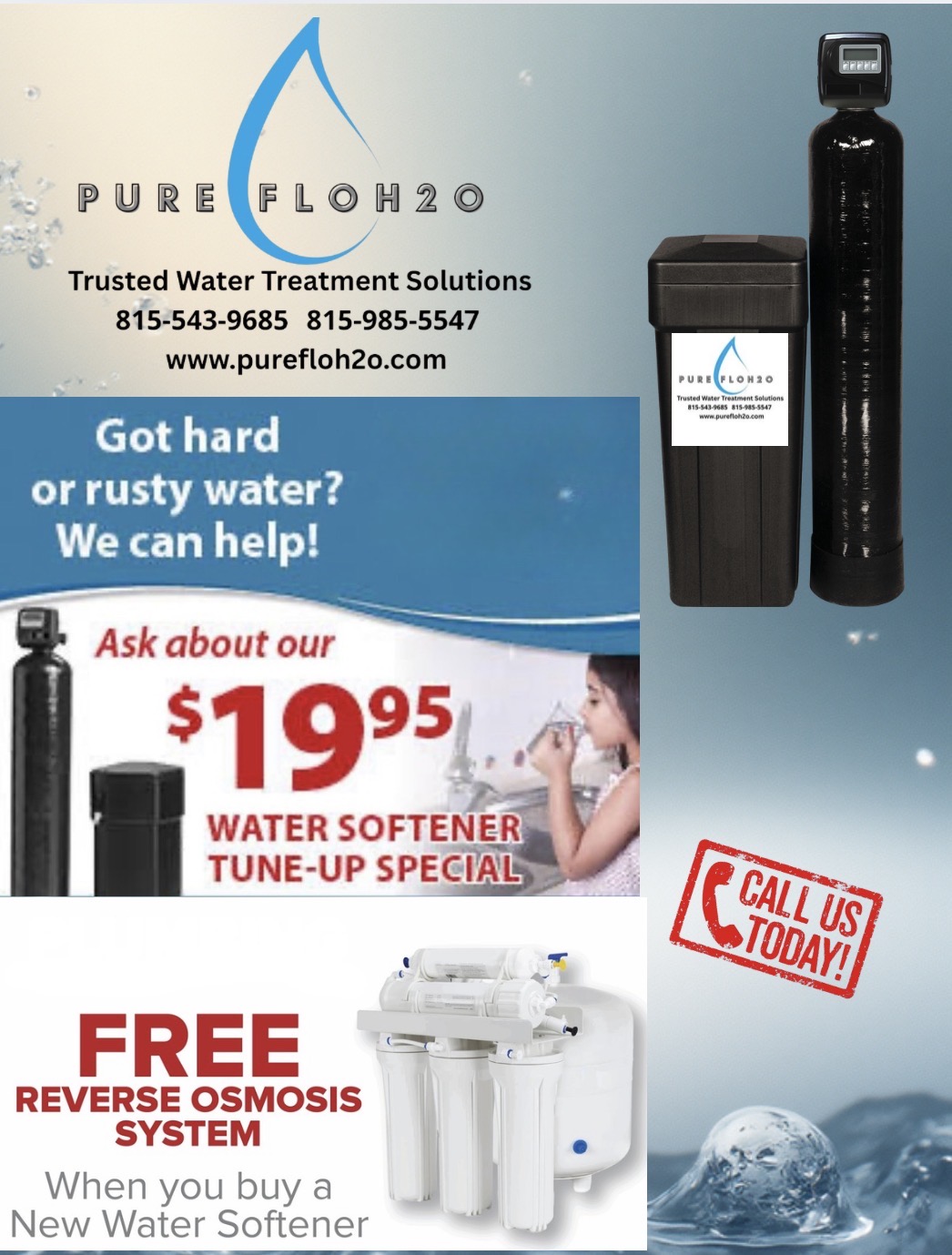 At Pure Flo H20, our mission is to ensure clean, safe, and accessible water for all communities through innovative treatment systems and personalized service. Every installation we complete reflects our slogan: “Clean Water. Clear Commitment.” It’s time to choose a team that values your health, your home, and your satisfaction. Improve your water quality and experience the difference that true professionalism and local expertise can make. Contact Pure Flo H20 today for trusted water softener installation in Rockford, IL.