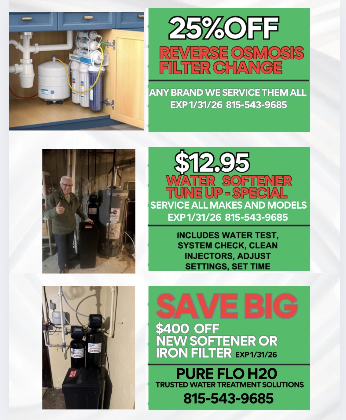 Services: Experience better water today with expert water softener installation from Pure Flo H20 in Rockford, IL. Call (815) 215-1101 to schedule your free estimate and discover how we can improve your home’s water quality. * Water Softening Equipment Supplier * Water Treatment Systems * Water Softener Installation Services * Water Softener Repair Services * Water Softener Maintenance Services * Reverse Osmosis Drinking Water Services * Reverse Osmosis Services * Filter Repair Services * Iron Filter Installation Services * Chlorine Removal Services * Ultraviolet System Services * RO Filter Change Services * Salt Delivery Services * Bradford White Water Heaters * Water Heater Repair * Water Heater Maintenance * Water Heater Installation